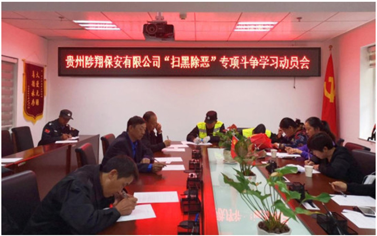 2019 年 4 月 8 日,貴州陟翔保安有限公司召集各區(qū)域經(jīng)理、項(xiàng)目經(jīng)理、項(xiàng)目隊(duì)長在公司會議室召開了“掃黑除惡” 專項(xiàng)斗爭學(xué)習(xí)動員大會。會議由公司總經(jīng)理陳春生主持,會上傳達(dá)學(xué)習(xí)了貴陽市公安局治安支隊(duì)保安服務(wù)管理大隊(duì)下發(fā)的《關(guān)于保安服務(wù)行業(yè)積極協(xié)助公安機(jī)關(guān)開展掃黑除惡專項(xiàng)斗爭和加強(qiáng)隊(duì)伍建設(shè)工作的通知》及《掃黑除惡應(yīng)知應(yīng)會》 知識,并就貫徹落實(shí)《通知》精神作周密的部署:一是要確實(shí)學(xué)懂弄通掃黑除惡專項(xiàng)斗爭的重大意義,從思想上高度重視;二是熟悉《掃黑除惡應(yīng)知應(yīng)會》知識,從行動上積極主動配合公安機(jī)關(guān)行動;三是認(rèn)真仔細(xì)開展排查清理保安員隊(duì)伍,對不適宜從事保安工作的人員迅速作清退處理,保持隊(duì)伍的純潔性;四是要將《通知》精神傳達(dá)到每個隊(duì)員,密切關(guān)注在職隊(duì)員的現(xiàn)實(shí)表現(xiàn),進(jìn)行動態(tài)管理,加強(qiáng)思想教育,及時制止不良苗頭;五是要規(guī)范隊(duì)員入職政審工作,嚴(yán)格按《保安服務(wù)管理?xiàng)l例》規(guī)定辦理入職手續(xù)。