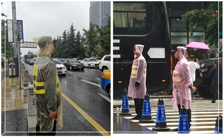 連日來的強(qiáng)降雨,加劇了執(zhí)勤的難度。保安隊(duì)員們頂著狂風(fēng)暴雨,從容不迫地在園區(qū)各條道路和重要路口上維護(hù)秩序、疏導(dǎo)交通、護(hù)送老人、為參觀者指路、引導(dǎo)車輛有序停放,即停即走......盡管雨越下越大,保安員們依舊身著濕透的保安服堅(jiān)守在自己的工作崗位。他們的身影也成為數(shù)博會(huì)現(xiàn)場一道亮麗的風(fēng)景線。